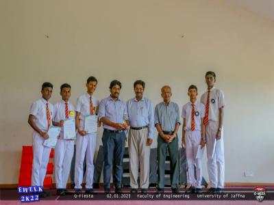 The Q-Fiesta competition, held on January 1, 2023, at the Faculty of Engineering, University of Jaffna, was a thrilling inter-school quiz event that brought together talented students from various schools, fostering a spirit of academic excellence and competition. As part of the Professor A. Thurairajah Quiz Competition, Q-Fiesta provided a platform for school students to engage in thought-provoking challenges, test their knowledge in engineering concepts, and enhance their analytical and problem-solving skills. π Venue: Faculty of Engineering, University of Jaffna π Date: January 1, 2023 Highlights of Q-Fiesta: πΉ Inter-School Competition β Students from different schools competed to demonstrate their expertise in engineering and general knowledge. πΉ Multiple Quiz Rounds β The contest featured engaging rounds that tested critical thinking, technical proficiency, and teamwork. πΉ Prestigious Sponsorship β LKR 150,000.00 was generously sponsored for the competition, supporting young minds in their pursuit of excellence. πΉ Legacy of Professor A. Thurairajah β Honoring his contributions to engineering education, the event encouraged students to aspire to higher academic goals. The competition was a huge success, fostering collaboration, intellectual growth, and healthy rivalry among school students, preparing them for future challenges in engineering and beyond.